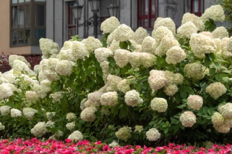 И, конечно же, мало кто откажется от такого сорта, как Ванилла Фрайз с ванильно-розовыми цветками, меняющими свою окраску от бутонов до полного роспуска, собранными в крупные, до 35 см, соцветия и источающими медовый аромат. В высоту куст достигает 2 м. Цветение продолжается с июня по октябрь.