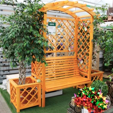 Красивая деревянная беседка Романтика для комфортного отдыха в саду. Ее главная особенность в том, что по бокам беседки расположены две кадки, в которые можно посадить как цветы, так и деревья, благодаря чему экстерьер вашего участка заметно преобразится. Беседка выполнена из качественных материалов, она не выгорает на солнце, устойчива к воздействиям влаги, перепадам температур и прочим внешним факторам. Рекомендуется покрыть дерево специальной пропиткой, для еще большей долговечности.