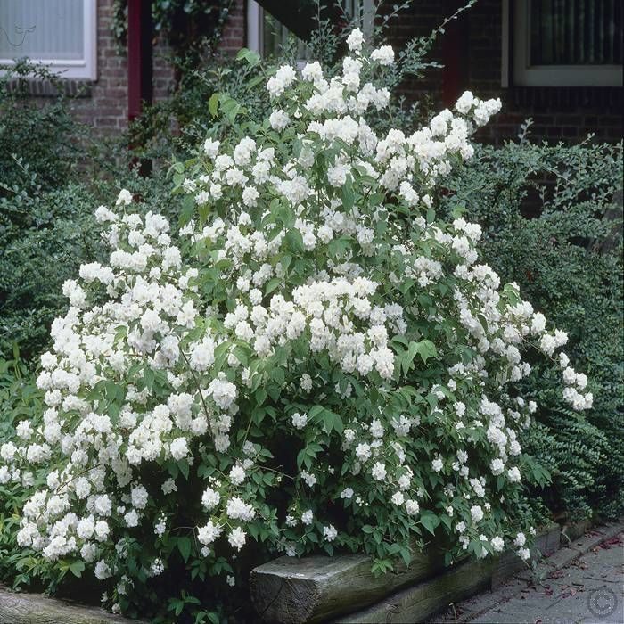 Махровые белоснежные цветки собраны в соцветия по 5-7 крупных цветков, с приятным земляничным ароматом. Цветение пышное, продолжительное. Крупные соцветия покрывают куст, превращая его в огромный белый букет.