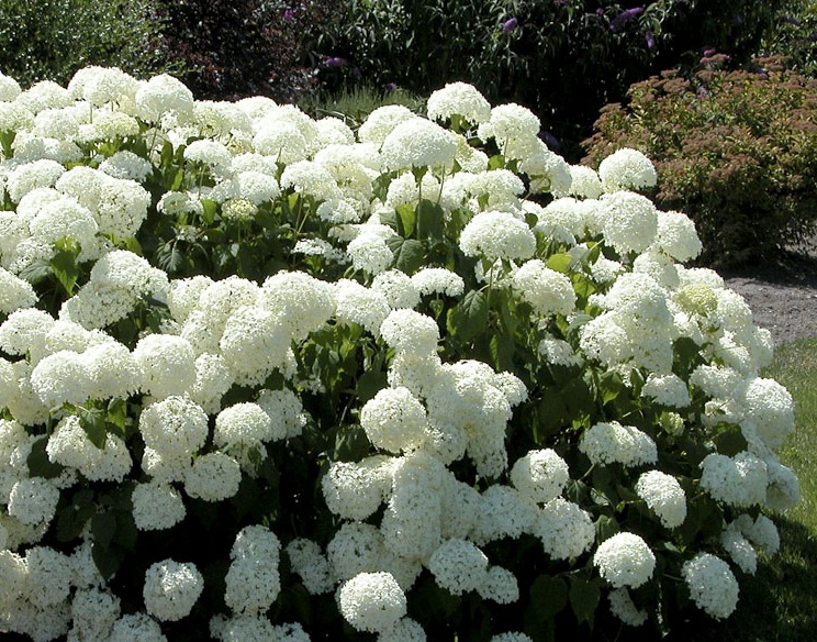Гортензия древовидная Анабель - неприхотливый вечнозеленый декоративный кустарник. Крона широкая, раскидистой формы. Максимальная высота растения 150 см. Листовые пластины яйцевидной формы, с зазубренными краями, зеленые. Цветет гортензия крупными шаровидными соцветиями кремово-белого окраса. Цветение обильное и пышное. Данный сорт внесет разнообразие в Ваш сад.