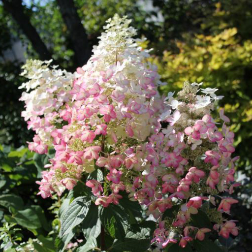 Гортензия метельчатая Энджелс Блаш – декоративный лиственный кустарник. Высота взрослого растения 2.5 м. Крона симметричная, широко раскидистая. Листья длинные, овальные, ярко-зеленые. Цветки собраны в пирамидальную метелку. Цветки вначале белые, затем розовые, осенью – красные. Продолжительность цветения с июля по сентябрь.