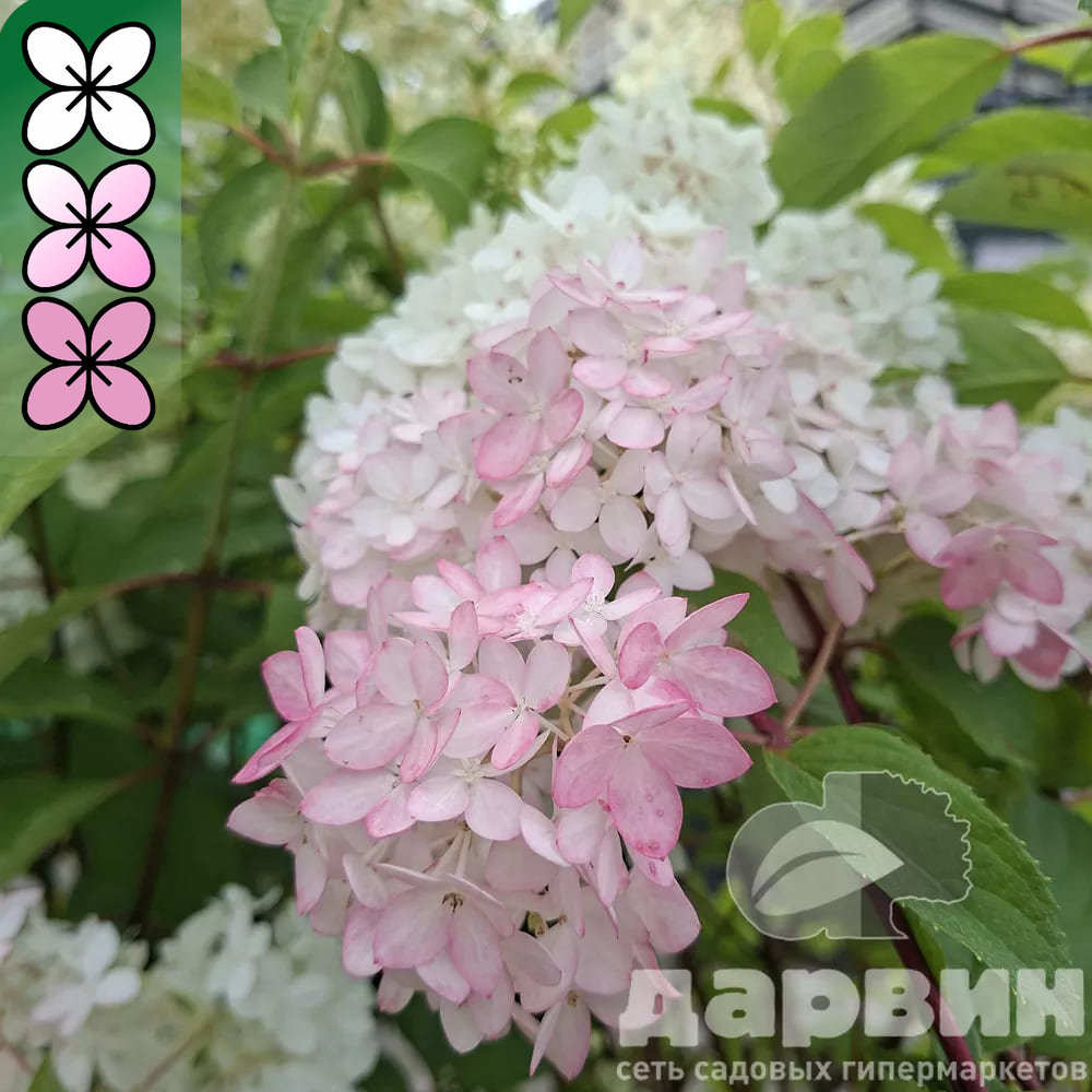 Листья гортензии Меджикал Андес овальные, насыщенного зеленого цвета, которые осенью приобретают теплые желтые и оранжевые оттенки, придавая кустарнику дополнительную декоративность. Цветение начинается в июле и продолжается до октября, когда соцветия пирамидальной формы достигают длины до 30 см. Изначально они окрашены в кремово-белые тона, затем постепенно переходят в нежные розовые, а к концу цветения становятся насыщенно-винными, создавая яркий и динамичный акцент в саду.