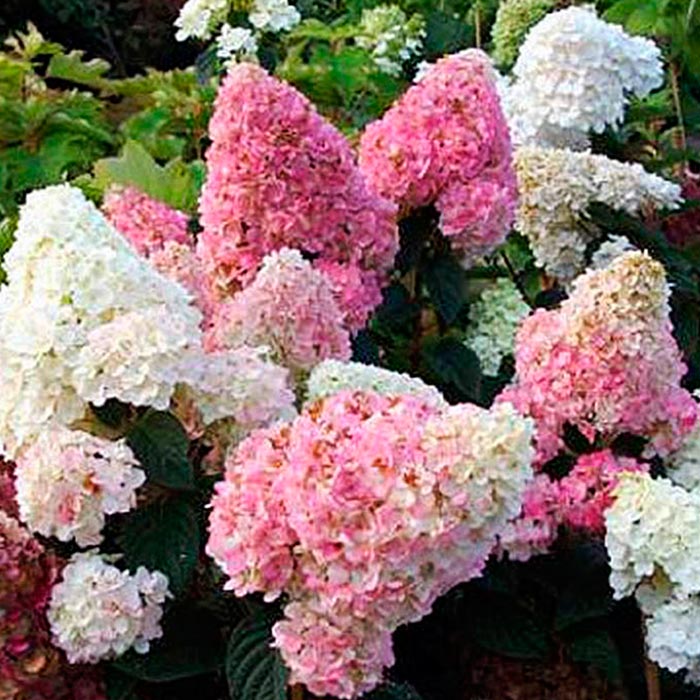 Гортензия метельчатая Ренсан – декоративный лиственный кустарник. Высота взрослого растения 1.5 м, диаметр 1 м. В первой половине лета на кусте образуются крупные соцветия пирамидальной формы. Сначала соцветия снежно-белые, но постепенно становятся розовыми, а к осени становятся малиновыми. Формы и оттенки цветка делают соцветия похожими на ягодный пломбир, поэтому этот сорт нередко называют «клубничным мороженым». Продолжительность цветения с июля по сентябрь.