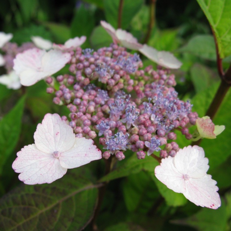 Гортензия Интермедия - неприхотливый вечнозеленый декоративный кустарник. Крона округлая. Максимальная высота растения 100-120 см. Листовые пластины яйцевидной формы, с зазубренными краями. Маленькие белые цветки с розовыми краями формируют соцветия дисковидной формы. Цветение обильное и пышное.
