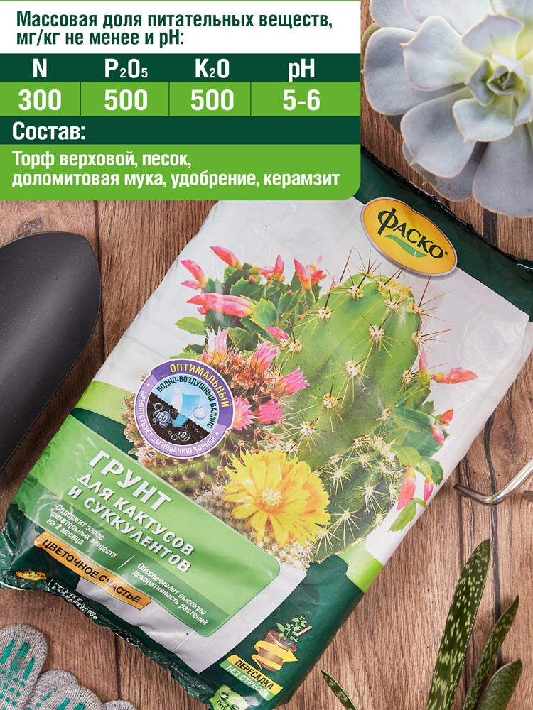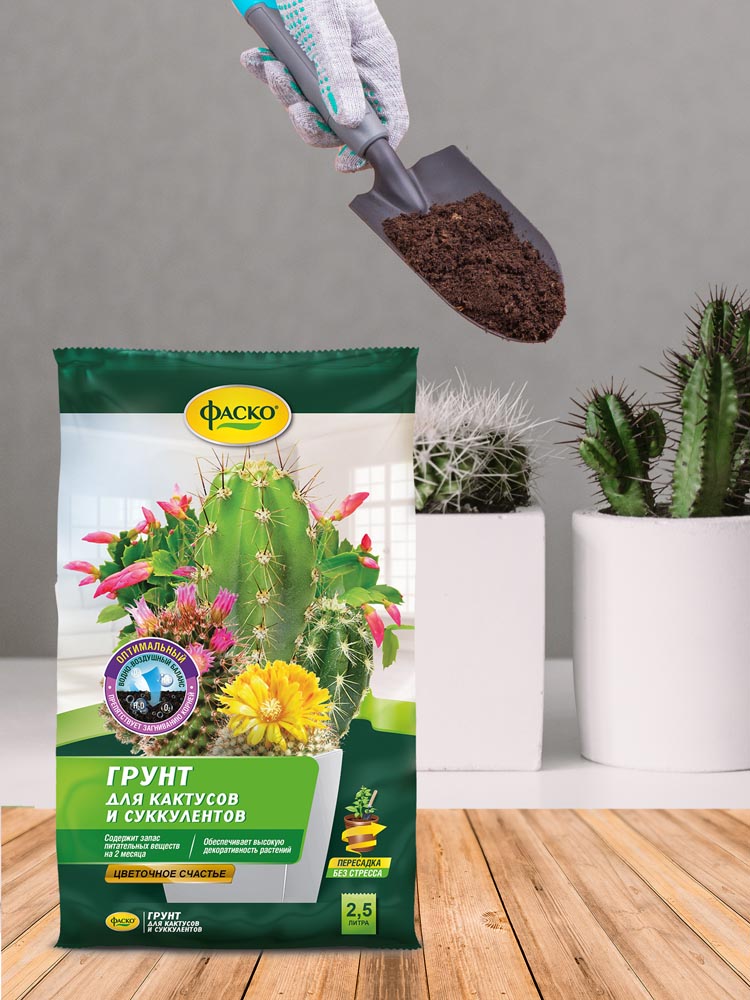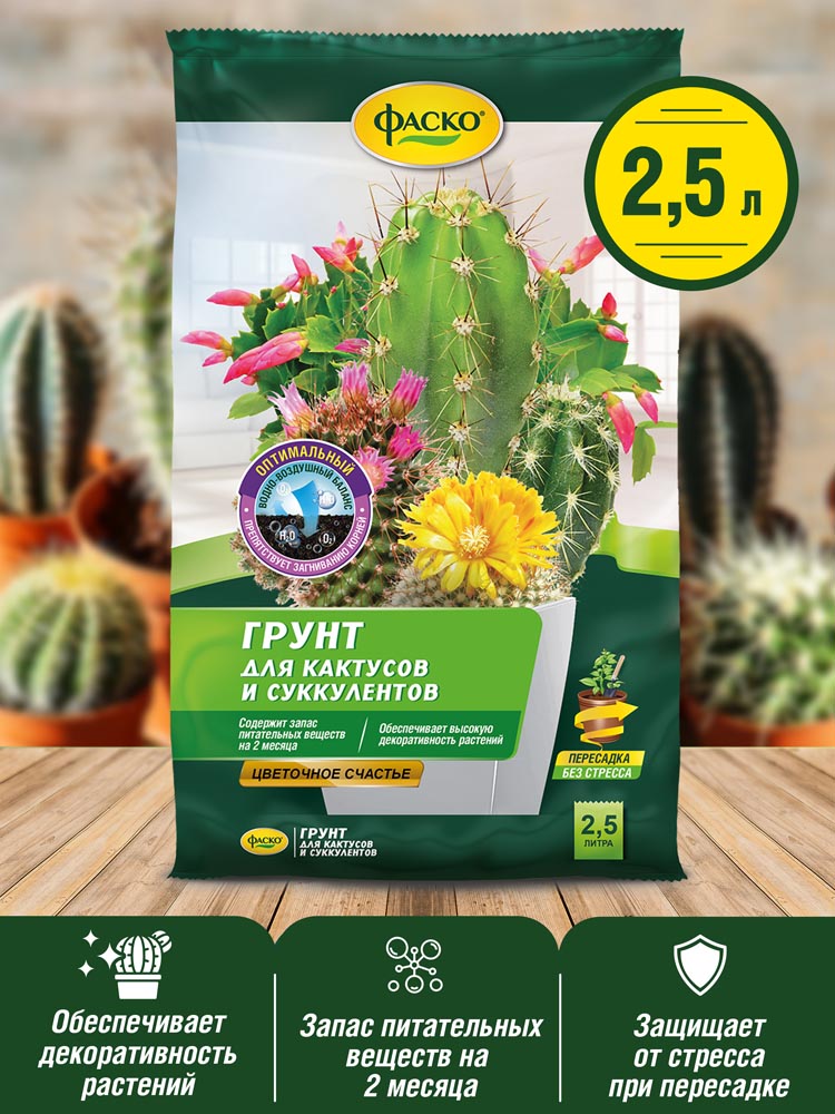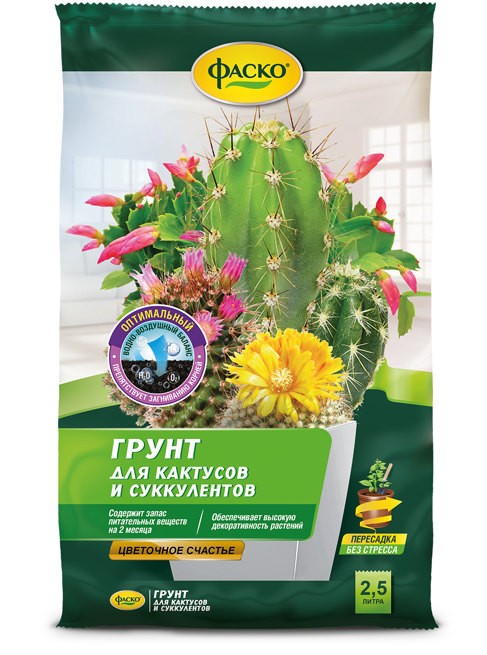 Грунт для кактусов Фаско «Цветочное счастье» - специальный грунт, имеющий в себе полезные биологические добавки и удобрения, стимулирующие здоровый рост и развитие кактусов. Также может быть использован вместе с какими-либо удобрениями. Грунт рыхлый, в меру увлажненный. После пересадки следует полить кактус и убедиться, что процесс пересадки прошел правильно. Безопасен при правильной эксплуатации.