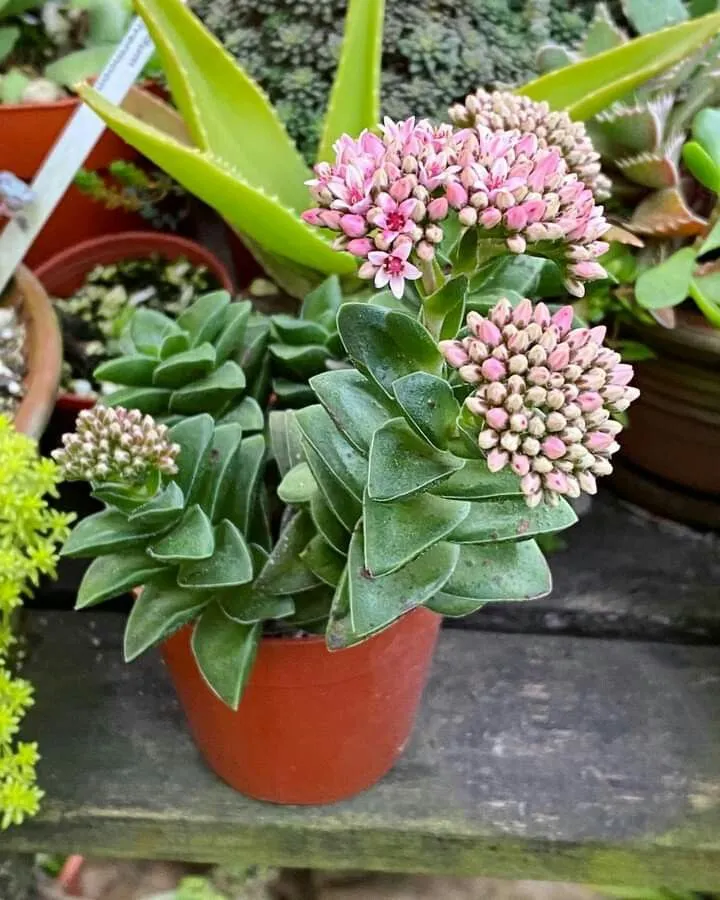 Листья: овальные с заострёнными концами, плотно расположены друг к другу, образуя розетки. Листовая пластина насыщенного зелёного цвета с лёгким голубоватым или серебристым налётом.