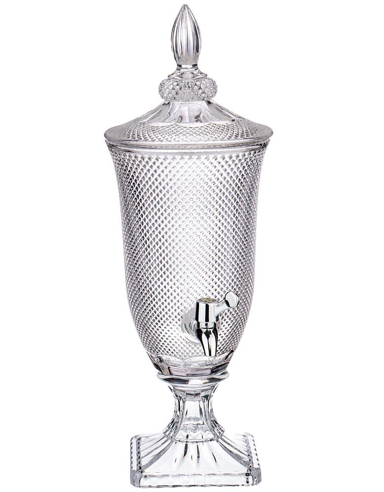 Лимонадница Муза - изысканный графин, который необходим для подачи безалкогольных напитков. Графин круглый с краном, на ножке, из прозрачного стекла, на стенках рельефные узоры. Это идеальный вариант, который поможет выполнить главную свою функцию при сервировке стола для большой компании, также сохранить качество продукции и обеспечить эстетический вид. Идеальный подарок для человека, увлекающегося производством домашних безалкогольных напитков.