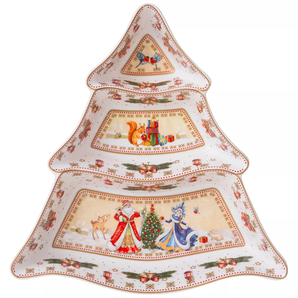 Менажница-елка Лефард Дед Мороз и Снегурочка - это кухонное приспособление, предназначенное для красивой подачи блюд, которые будут разделены на три секции. Менажница имеет стильный и новогодний дизайн. Изготовлена из фарфора в форме елки. Будет радовать вас и ваших гостей своей легкостью и эстетичностью. Отлично подойдёт как для праздничных столов, так и будничных обедов. Посуда создаст на вашей кухне атмосферу новогоднего тепла и уюта.