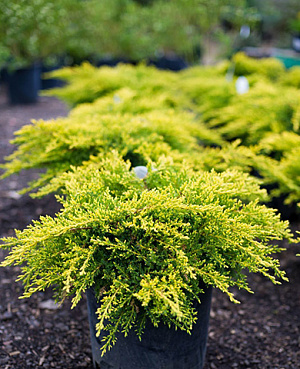 Можжевельник средний Олд Голд – декоративный вечнозеленый кустарник. Максимальная высота взрослого растения 150 см, диаметр 250-300 см. Форма кроны широкая, плоская. Хвоя чешуйчатая, золотистого окраса с бронзовым оттенком. Шишки появляются редко.