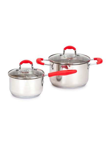 Набор Фенси включает в себя ковш кухонный объемом 1,7 л с удобной крышкой диаметром 16 см, а также кастрюлю вместимостью 3,3 л с практичной крышкой диаметром 20 см. Ковш и кастрюля изготовлены из высококачественной нержавеющей стали с защитой от коррозии, царапин и деформаций.