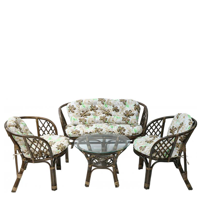 Мебельный комплект из ротанга станет прекрасным дополнением к чайному домику, беседке или другой зоне отдыха. Позволит комфортно отдохнуть или принять гостей. Красивый дизайн и плетеные элементы будут перекликаться с декоративными растениями в саду. Комплект состоит из двухместного дивана, двух кресел и столика и рассчитан на четырех человек. Мягкие элементы легко убирать для последующей стирки, а мебель можно очистить простыми бытовыми средствами. Набор выполнен из прочных материалов, поэтому мебель не выгорает на солнце и устойчива к низким температурам.