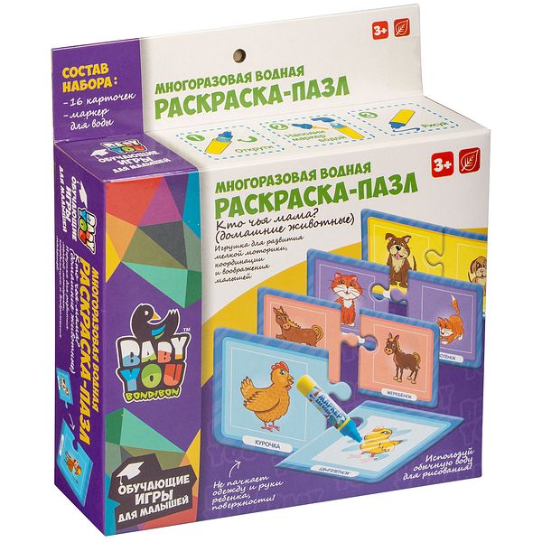 Набор пазлы-водные раскраски Бондибон Кто чья мама? домашние животные - это волшебный набор для самых маленьких любителей творчества. Необходимо всего лишь наполнить специальную ручку обычной водой и провести ей по раскраске. Как по волшебству появятся изображения домашних животных и их детёнышей. Раскраски многоразовые, ваш малыш сможет раскрашивать их снова и снова. Данный набор развивает аккуратность, мелкую моторику и креативное мышление малыша. Ваш маленький непоседа будет проводить время с пользой.