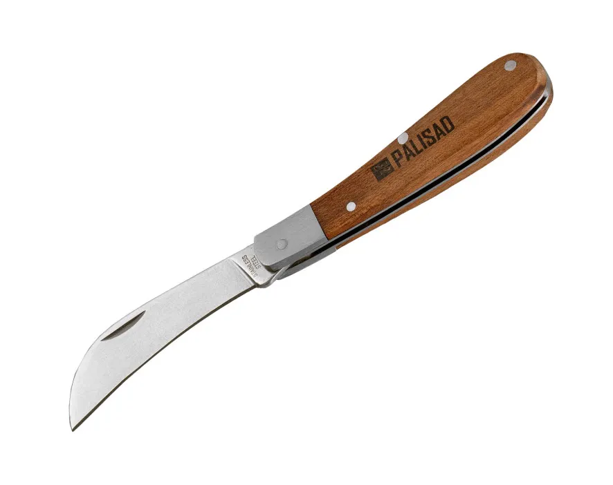 Складной нож длиной 170 мм с деревянной рукояткой имеет изогнутое серповидное лезвие, которое легко срезает ветки и грибы. Пригодится садоводам для удаления шипов со стеблей, зачистки поперечных срезов и других работ. Складная конструкция обеспечивает безопасное хранение и транспортировку – лезвие спрятано в корпус. Для сохранения остроты и предотвращения налёта рекомендуется после использования протирать лезвие сухой салфеткой и смазывать маслом.
