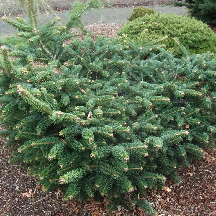 Пихта греческая Мейерс Дварф (Meyer's Dwarf) – декоративное хвойное дерево. Медленнорастущее. Крона плоская, раскидистая, плотная, с горизонтально растущими ветвями, диаметр 100 см. Хвоя густая, жёсткая, темно-зеленого цвета, внизу имеются две белые полоски. Весной молодые побеги светлее. Плод-шишка узкая, длинная.