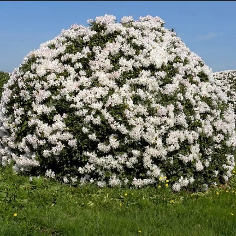 Рододендрон гибридный Каннингемс Вайт – вечнозеленый декоративный кустарник. Максимальная высота взрослого кустарника 120 см. Крона округлая, компактная. Листовые пластины темно-зеленые, матовые. Цветет белоснежными цветками. Цветение обильное.