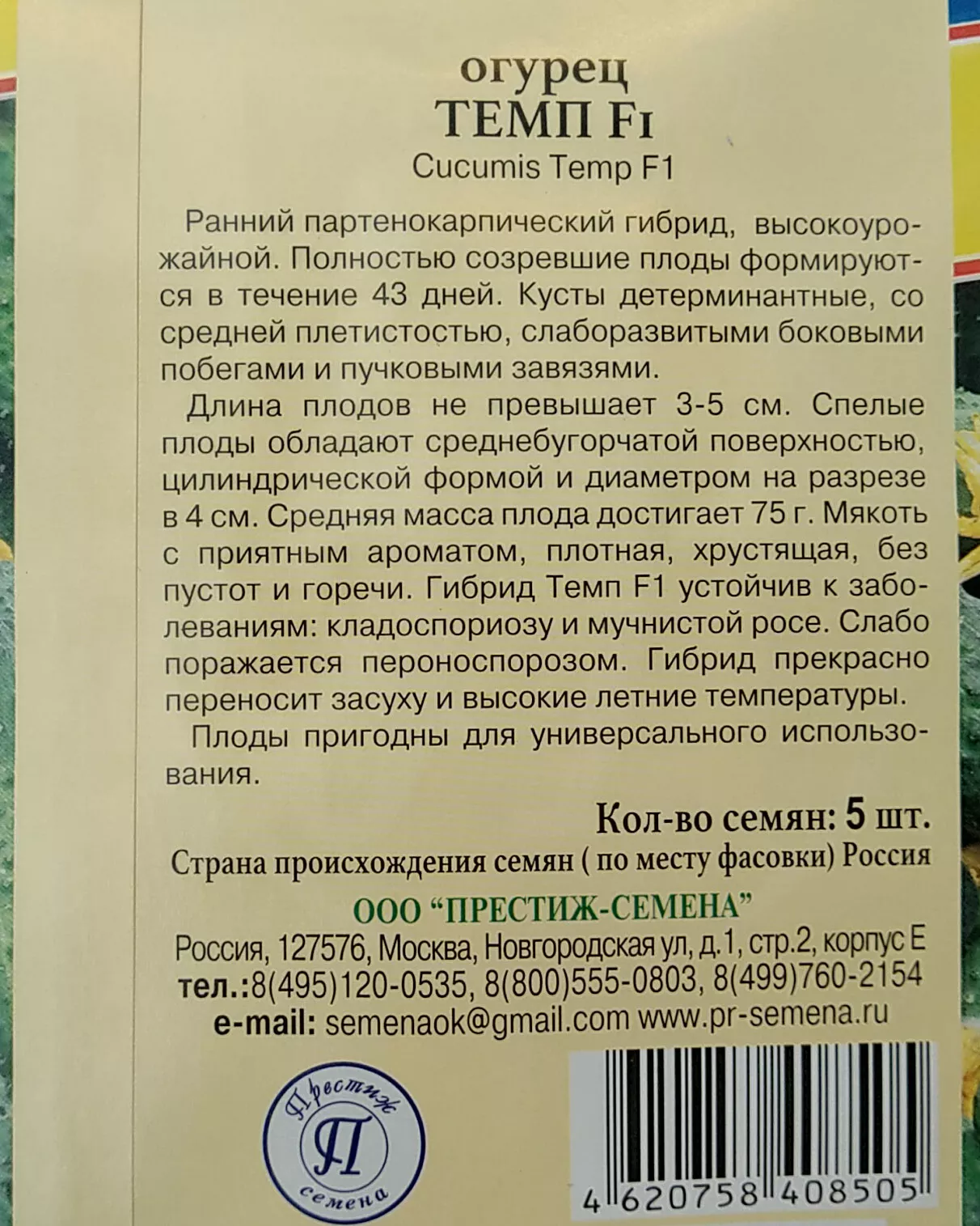 Огурец Темп – гибридный сорт раннего срока созревания, с высокой урожайностью. Куст средневетвистый. Урожайность с одного кв. м. до 26-30 кг.