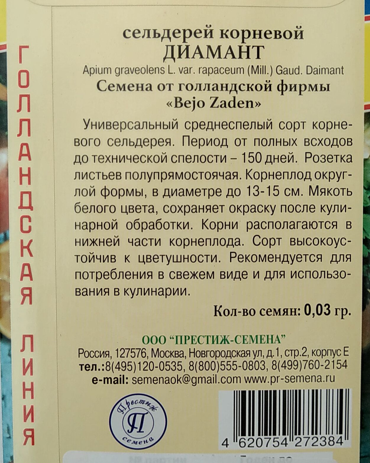 Сельдерей корневой Диамант – сорт среднераннего срока созревания, с урожайностью 1 кв.м. 3-4 кг. Корнеплод округлой формы, желтовато-серого окраса, массой 600-1200 гр. Мякоть белая, нежная, сочная. Сельдерей имеет высокое содержание полезных веществ.