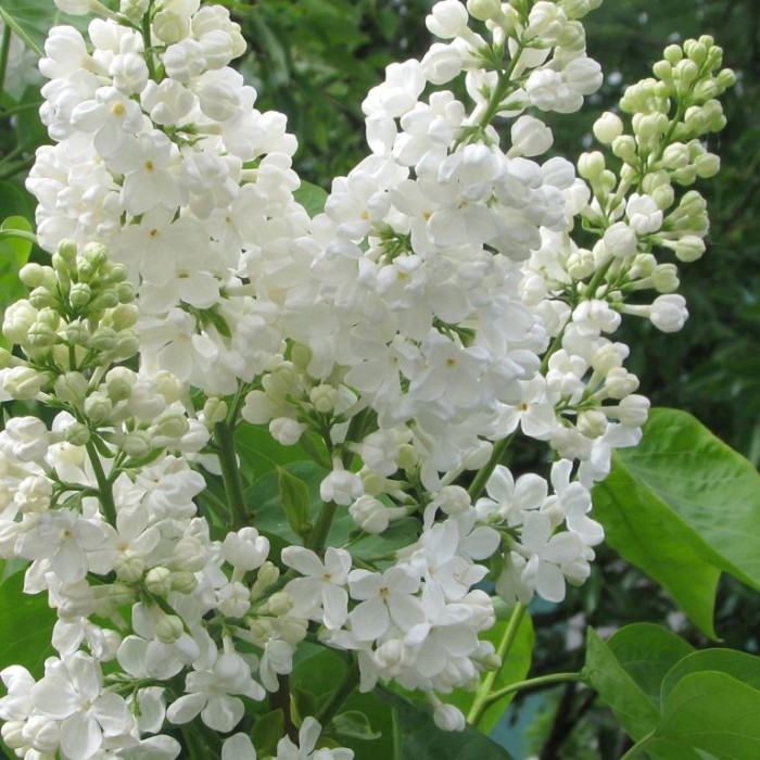 Бутоны зеленовато-кремовые, цветки белые, крупные, простые. Диаметр цветка до 2 см. Аромат слабый. Соцветия пышные, до 28 см.
