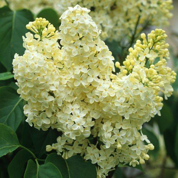 Кремовато-желтые простые цветки собраны в много верхушечные пышные соцветия. Крупные, длина соцветия 15-20 см. Цветет обильно. Этот сорт сирени считается единственным сортом с желтыми цветами.