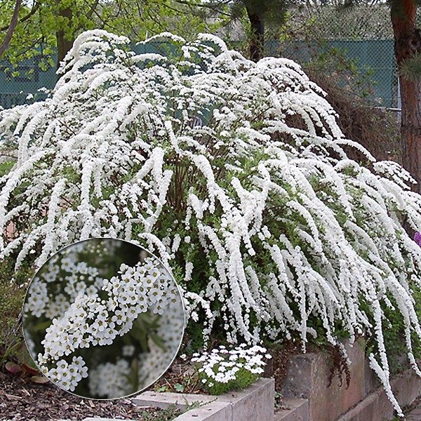 Спирея Грефшейм серая , Питомник Школьный сад - декоративный, красивоцветущий кустарник с ниспадающими дугообразными ветвями. В высоту достигает 120-150 см., в диаметре 180-200 см. Крона раскидистая, побеги красно-коричневые. Листья ланцетные, заостренные, немного опушенные, длиной 2-4 см. Название "серая" спирея получила  из-за необычной окраски листьев в весенне-летний период: они пепельно-зеленого цвета. Осенью окраска меняется на золотисто-желтую. Соцветия - пышные зонтики, собранные из мелких, махровых, белоснежных цветков с золотистыми тычинками. Цветение обильное с мая по июнь. Зимостойкость высокая.