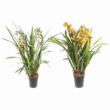 Цимбидиум – вид орхидей, отличающийся обилием ярких цветов, плотными тёмно-зелеными листьями и продолжительным цветением. В летнее время необходимая температура составляет +20 градусов днем и +12 ночью, а в зимнее время достаточно +15 градусов по цельсию круглосуточно. Полив умеренный, в качестве почвы обычно используют специальные смеси для орхидей.