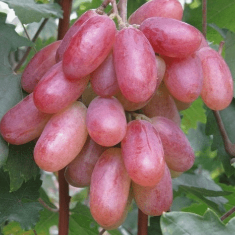 Виноград Преображение розовый – сорт очень раннего срока созревания. Длина побегов 300 см. Ягоды цилиндрической формы, розового окраса. Мякоть мясистая, хрустящая, на вкус сладкая. Гроздья конической формы, средней плотности, массой 700-1900 гр. Урожайность с одного растения до 25 кг. Созревание наступает на 95 день, в августе.