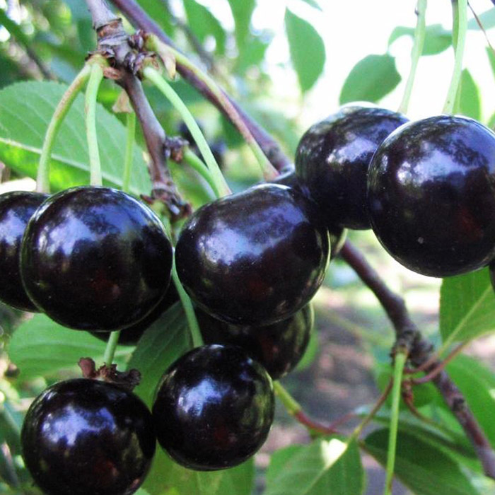 Плоды сердцевидные, плодовая воронка широкая, верхушка закругляется. Плодоножка короткая. Размер средних ягод 21х16 мм, толщина мякоти – 14 мм. Вес ягод – от 4,1 до 5 г. Кожица плотная, тонкая, к сроку созревания приобретает насыщенный почти черный оттенок. Интенсивный цвет ягод и дал название сорту..