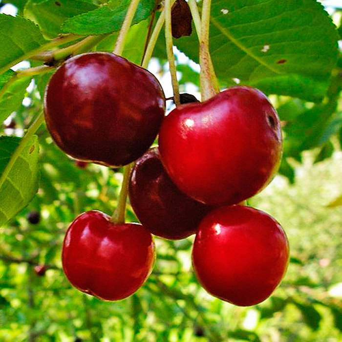 Плоды от мелких до средних. Кожица зрелых вишен окрашена в густой, почти черный оттенок бордового цвета. При внимательном рассмотрении на поверхности ягоды можно различить сероватые пятна. Мякоть плотная, бордово-красная, сочная.