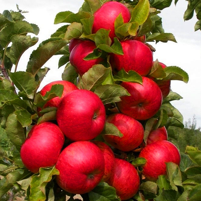 Яблоня колонновидная Розовая сказка - сильнорослая колонновидная яблоня декоративного назначения. Цветки крупные, лиловые. Среднего срока цветения. Листья матовые, тёмно-зелёные.