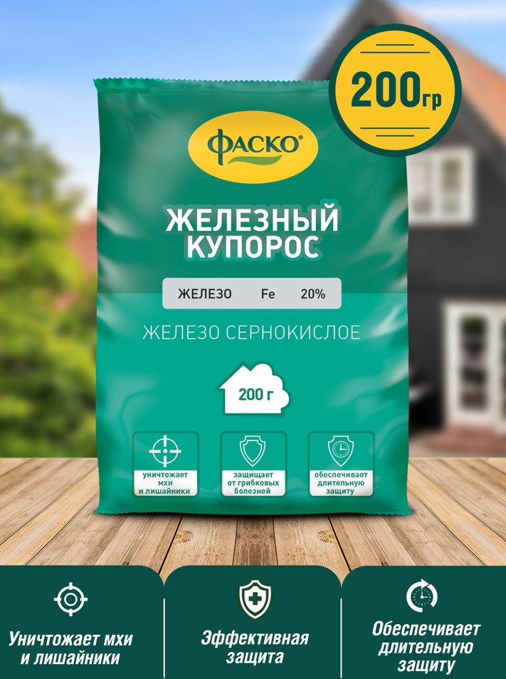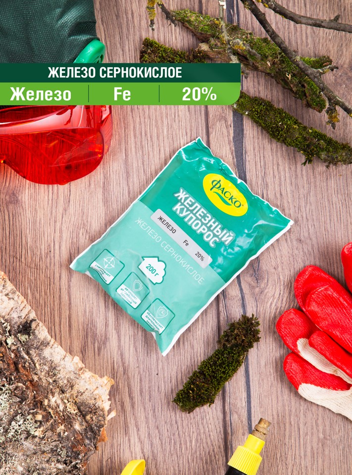 Железный купорос Фаско -высокоэффективное вещество для лечения и профилактики различных заболеваний (парша, монилиоз, антракноз и д.р) у растений любого вида. Применение сульфата железа приводит к усыханию мягких тканей растений, тем самым уничтожая мох, лишай и споры грибов с коры деревьев и кустарников. Препарат также убивает насекомых-вредителей, живущих под корой. Средство используется в качестве удобрения на бедных и истощенных почвах. Готовый раствор можно использовать только весной, до распускания почек или осенью, после опадания листвы.