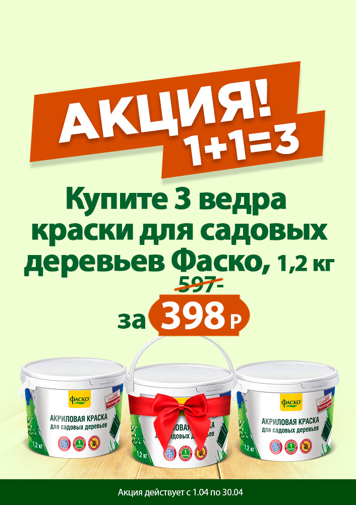 А Вы уже подготовили сад к сезону? Мы запускаем супер-акцию для заботливых садоводов: при покупке 3-х ведер краски для садовых деревьев ФАСКО (1,2 кг) — платите вы только за 2*!